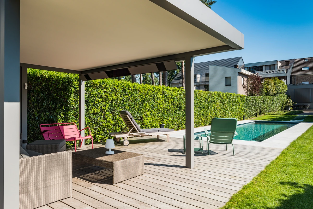 La Renson Algarve Canvas creada para ofrecer protección total y confort exterior durante todo el año. Su estructura de aluminio minimalista se adapta perfectamente a cualquier estilo arquitectónico, ya sea como pérgola independiente o adosada a fachada.